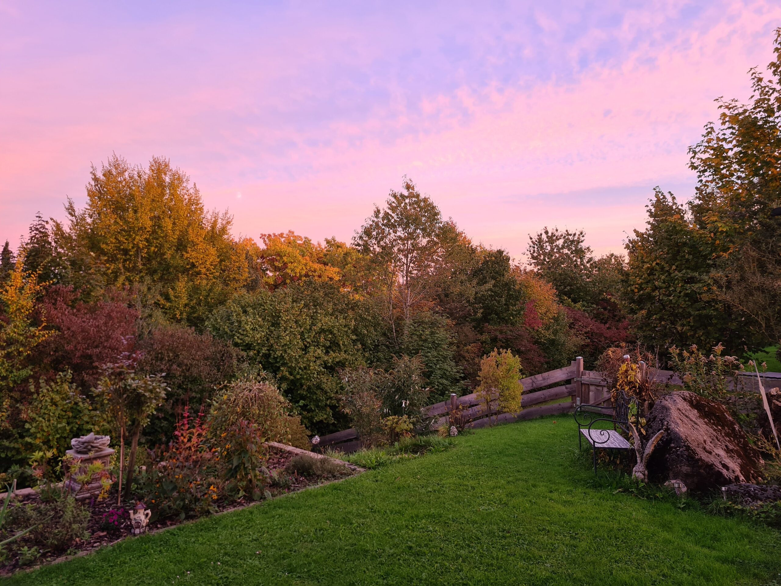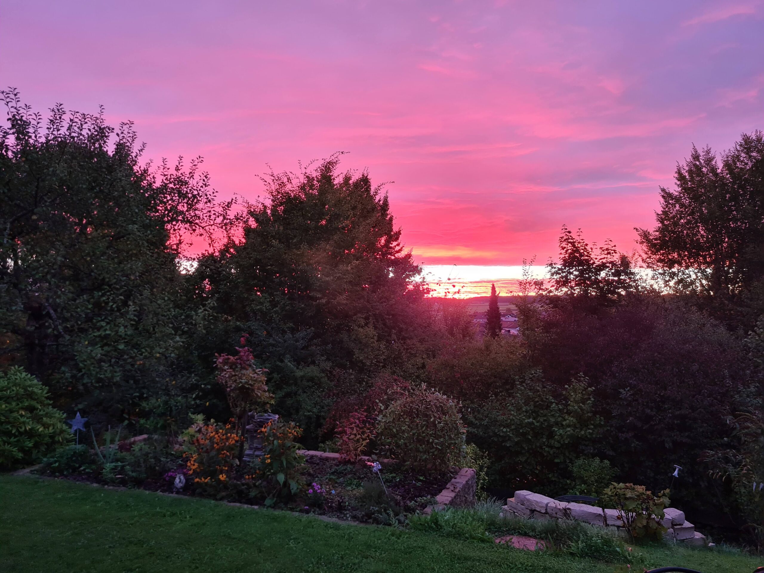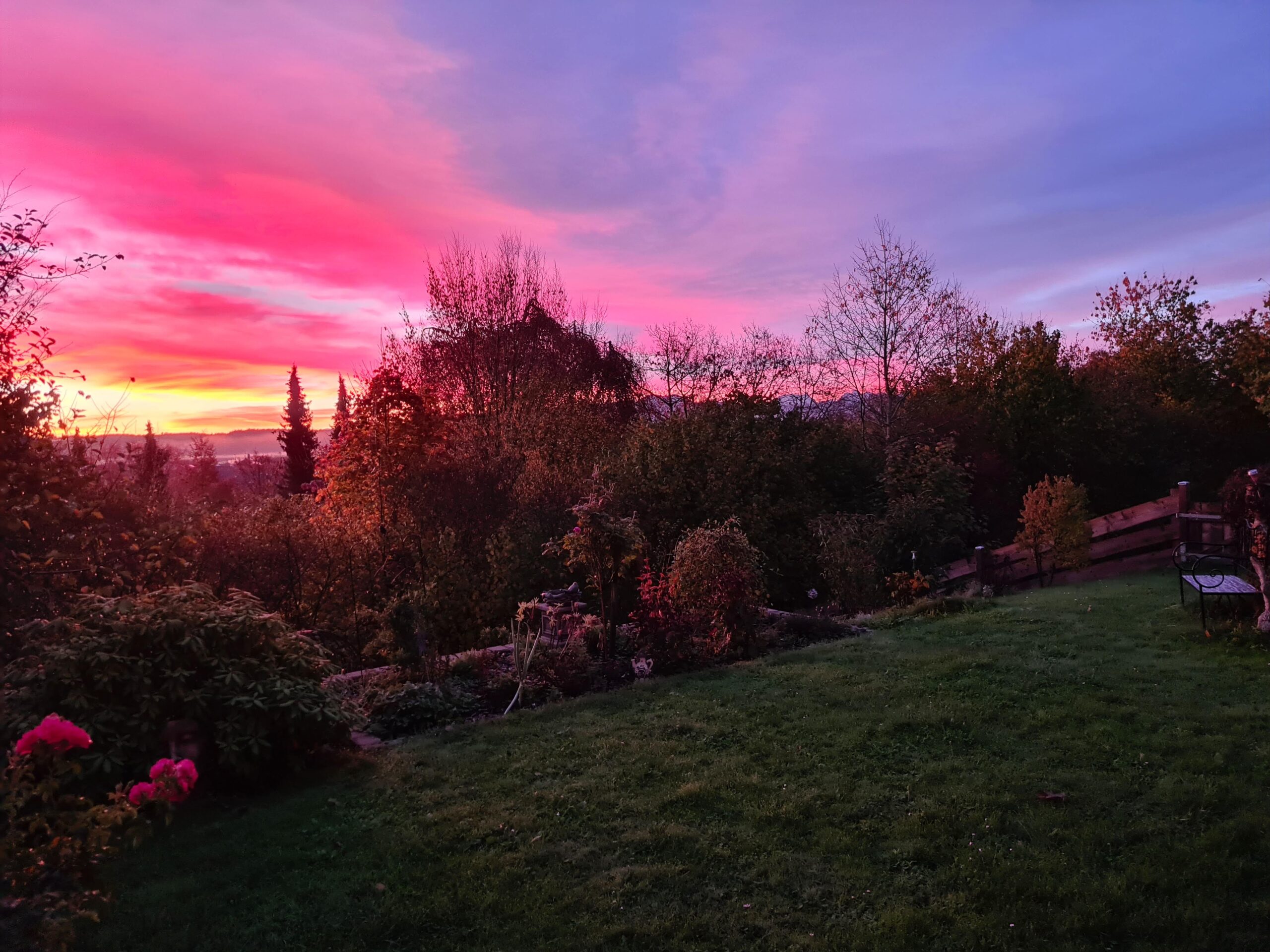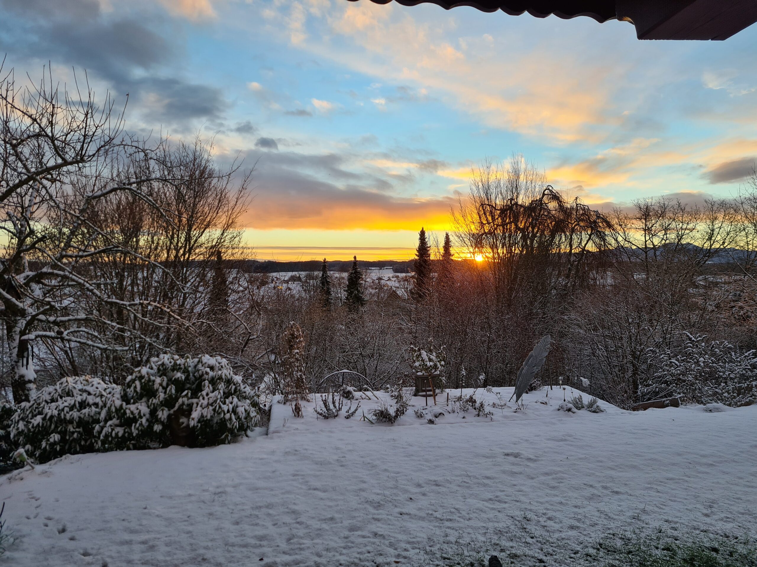 Bestimmt habe ich unseren Ausblick schon mehrere hundert Male geknippst (hier nur eine Auswahl :o) ). Es tut so gut, dort hinaus zu sehen, die Weite zu erfassen und die eigenen Gedanken treiben zu lassen. Viele Jahre hatte ich das nicht. In der Großstadt blickte ich auf andere Häuserwände oder den Verkehr. Und später bei meinem ersten Haus in Bayern auf einen faden Wohnblock. Da ging ich dann immer an einem Flusskanal spazieren und bekam die Weite, von der mein Wohnzimmer noch viele Jahre träumen sollte :-).